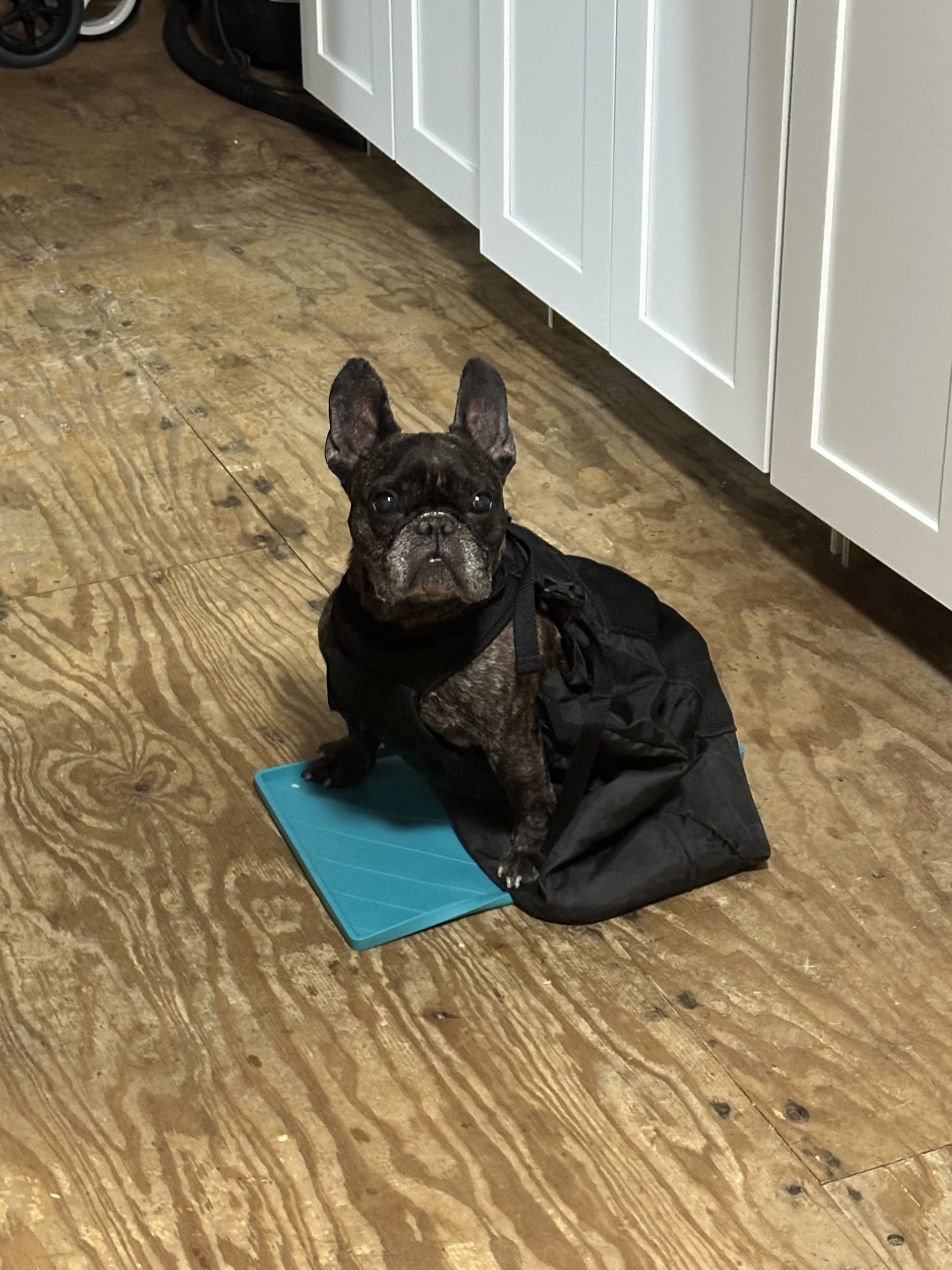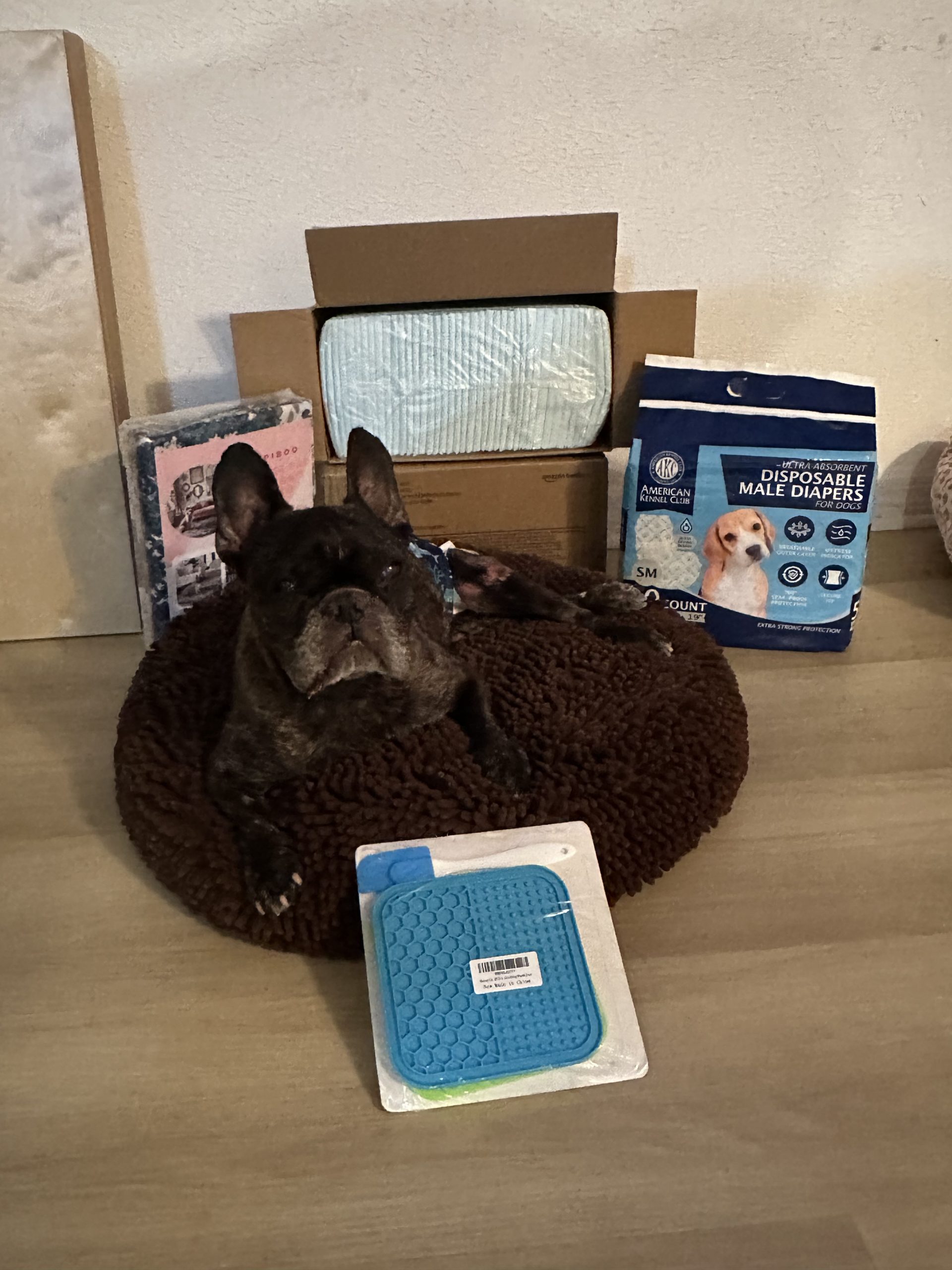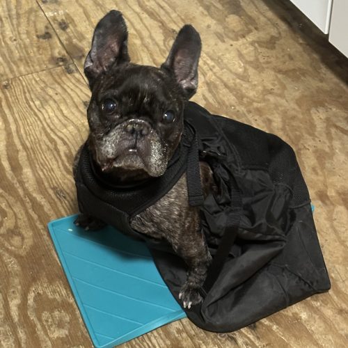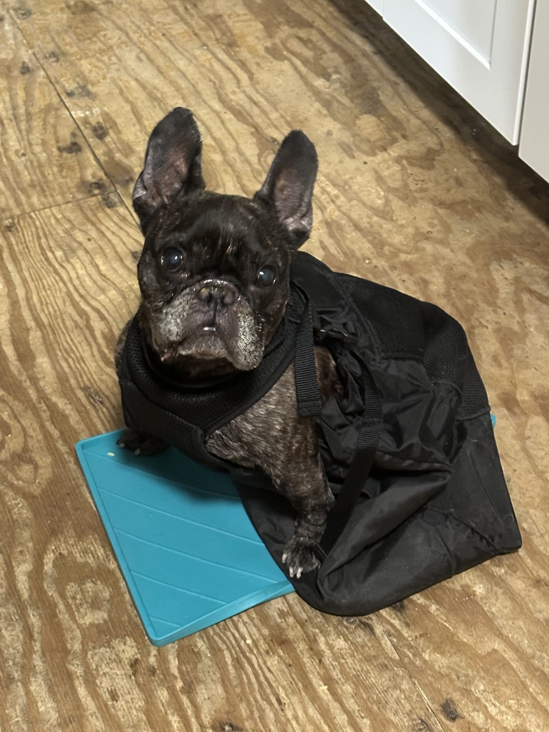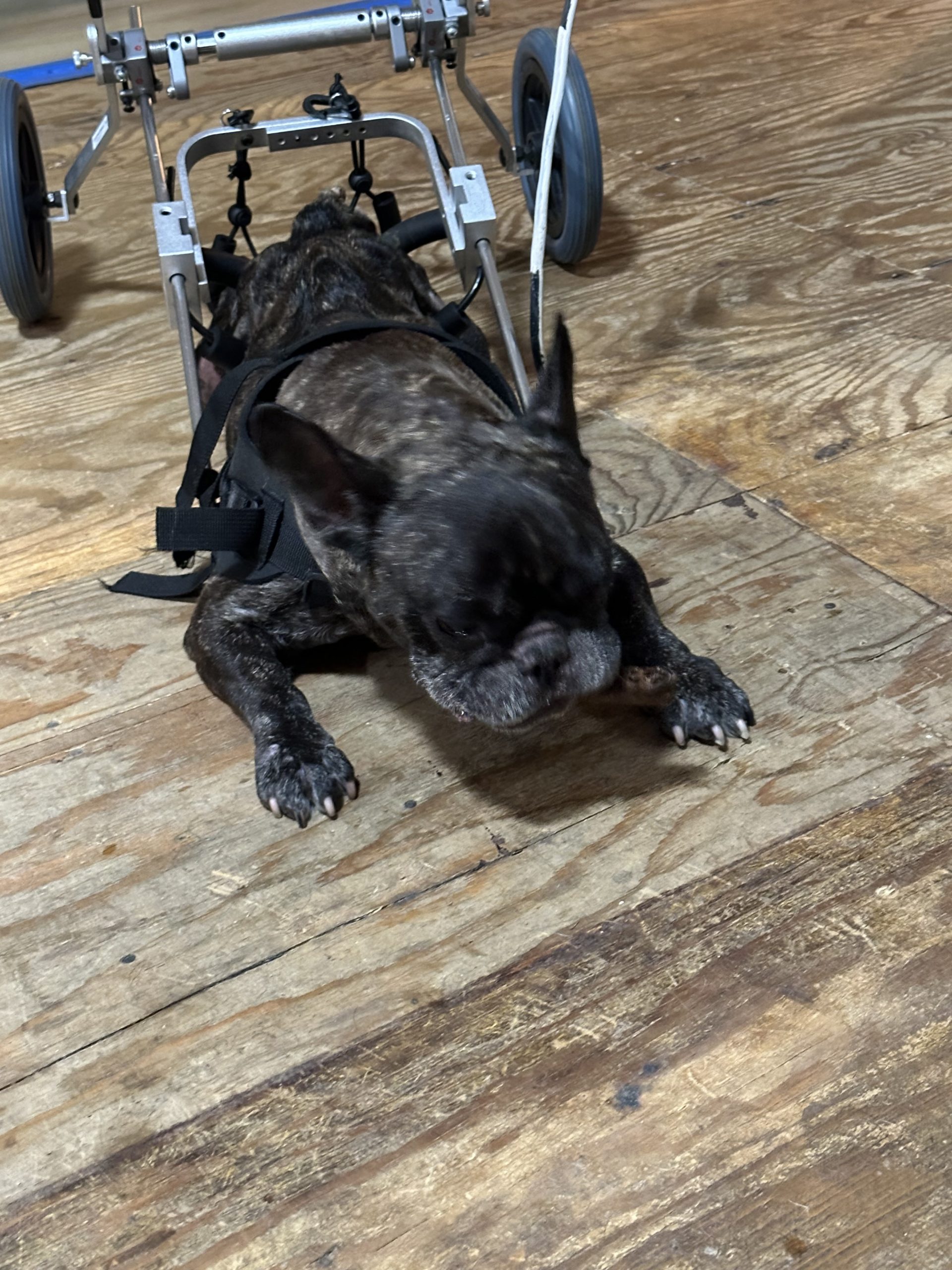 Bane is paralyzed, though he can stand for a few seconds and moves his legs when he’s in his wheelchair. He’s incontinent and needs diapers/belly bands and manual bladder expression, but he’s surprisingly cooperative. He’s great about holding his poop until bladder time (thank you, Bane!), and he does well in his belly band about 95% of the time.