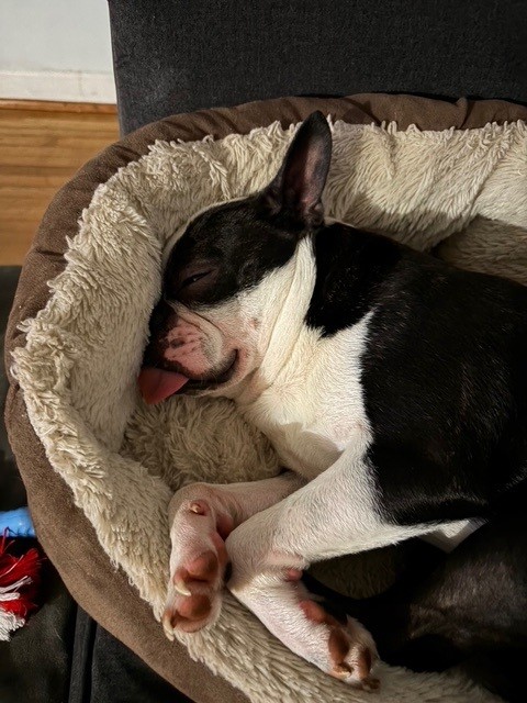 Bucky is both crate trained and house trained. He snoozes happily on the couch in the evenings and then sleeps through the night in his crate. He's also perfectly content napping in his crate when his family is out.