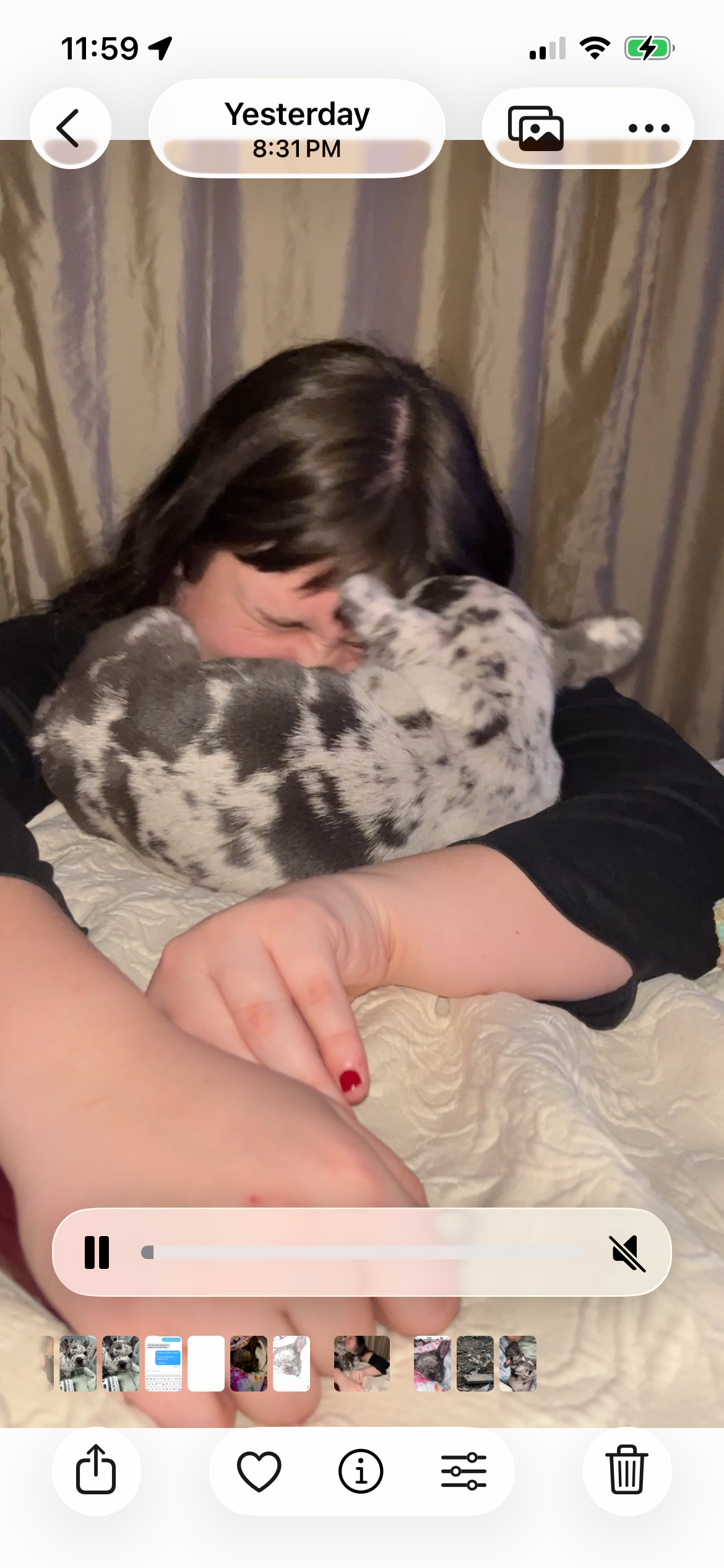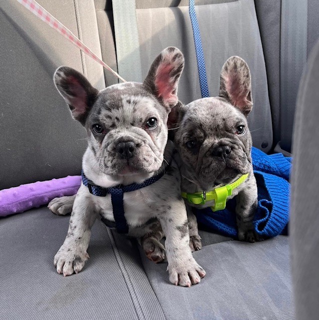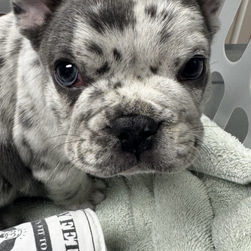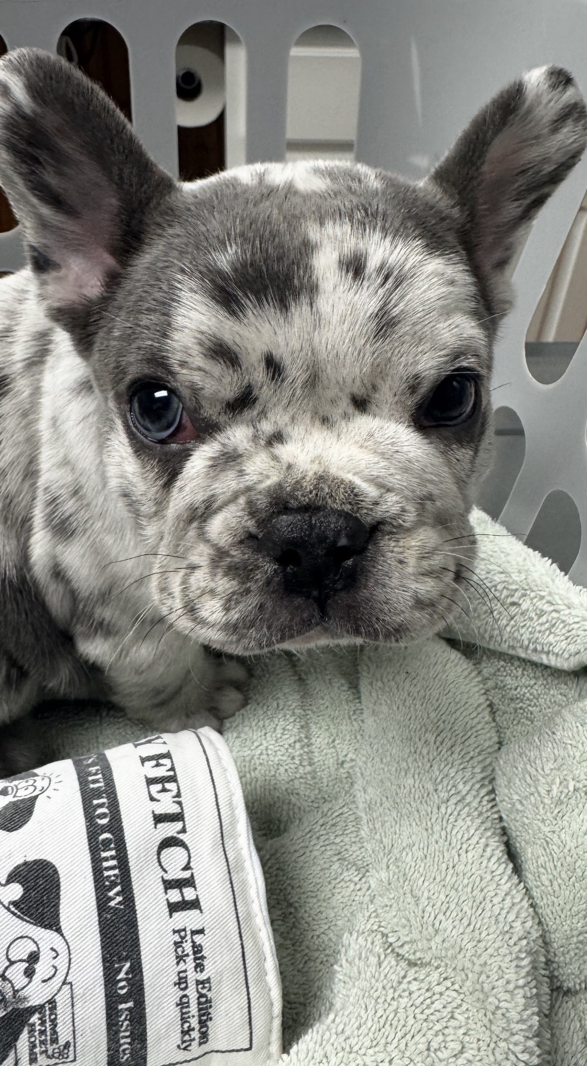 Chunky is an 8.8-lb blue merle Frenchie puppy with showstopper looks and an even bigger personality. Compliments follow him everywhere, and he accepts them graciously..unless food is nearby. Then he becomes a tiny, dramatic thespian convinced every snack on earth belongs to him - yours, his, and especially the cat's.