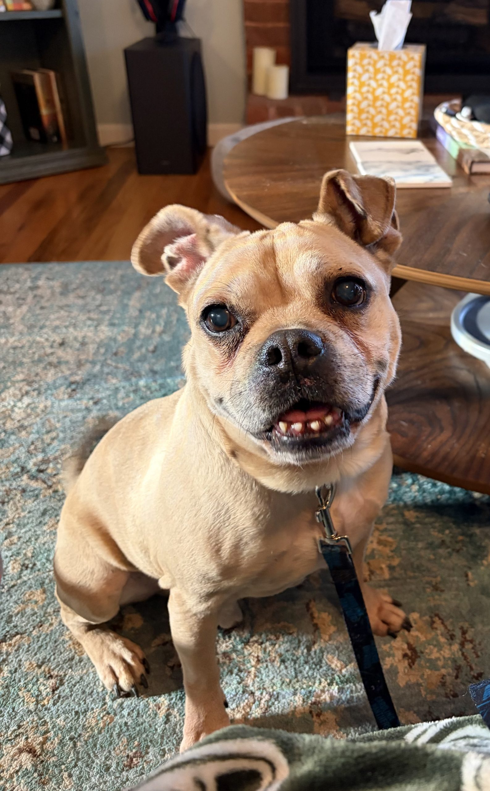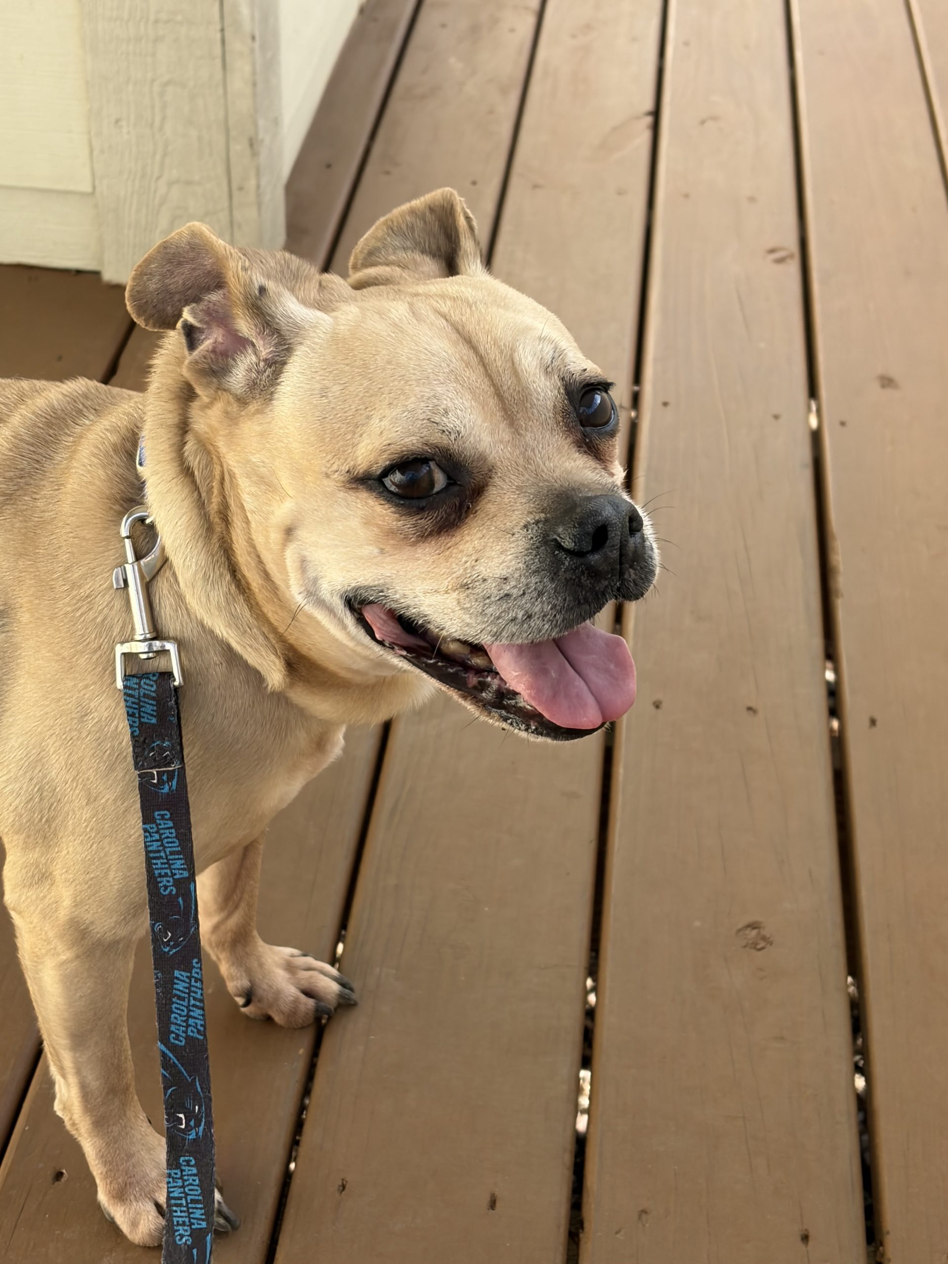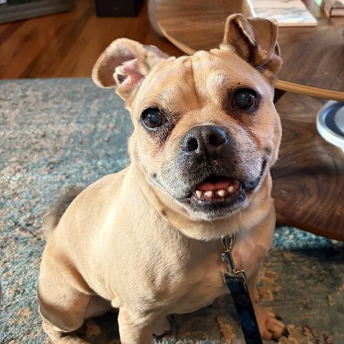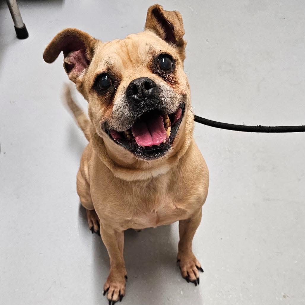 Stitch is about 8 years old and appears to be a delightful mystery mix of pug/chihuahua/pit bull. He’s got the body of a pug, the head of a chihuahua/pit bull, and the personality of a stand-up comedian. The result? A wonderfully goofy little guy who looks slightly surprised by his own existence and keeps his foster family laughing every single day.