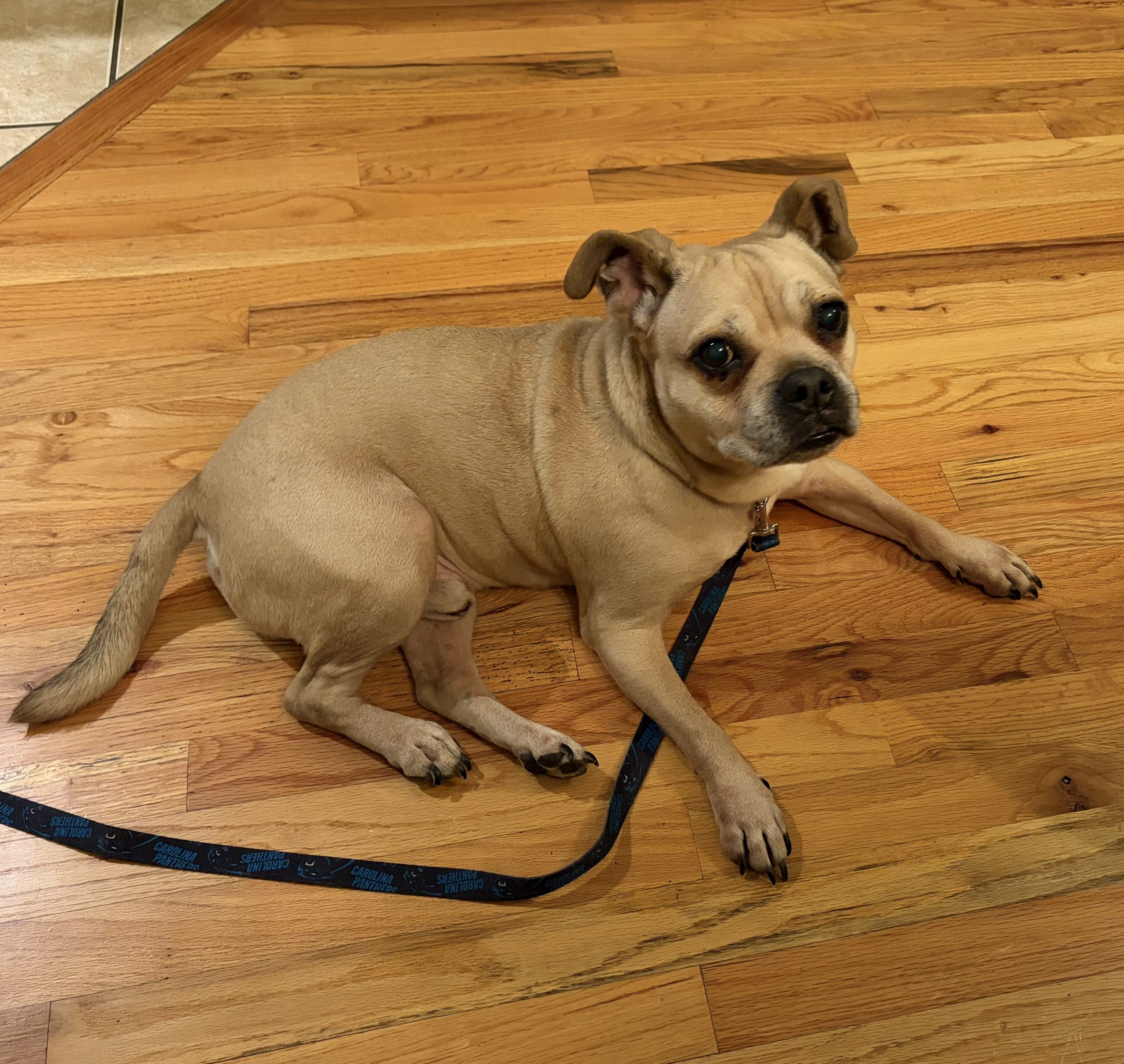Despite his unique look, Stitch is an absolute sweetheart. He’s dog friendly, house trained, and currently working on crate training like the responsible gentleman he is. He can get excitable and high-energy when he’s feeling playful (zoomies may occur), but he’s equally passionate about his second favorite hobby: quality couch time with his people.