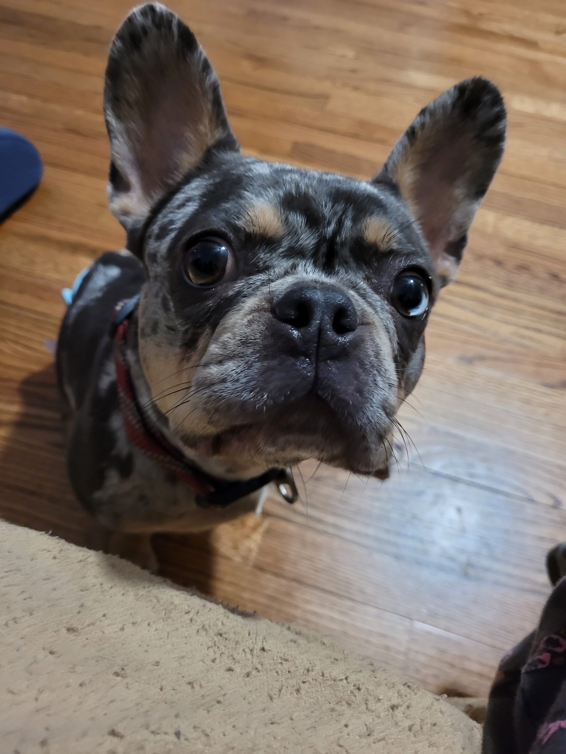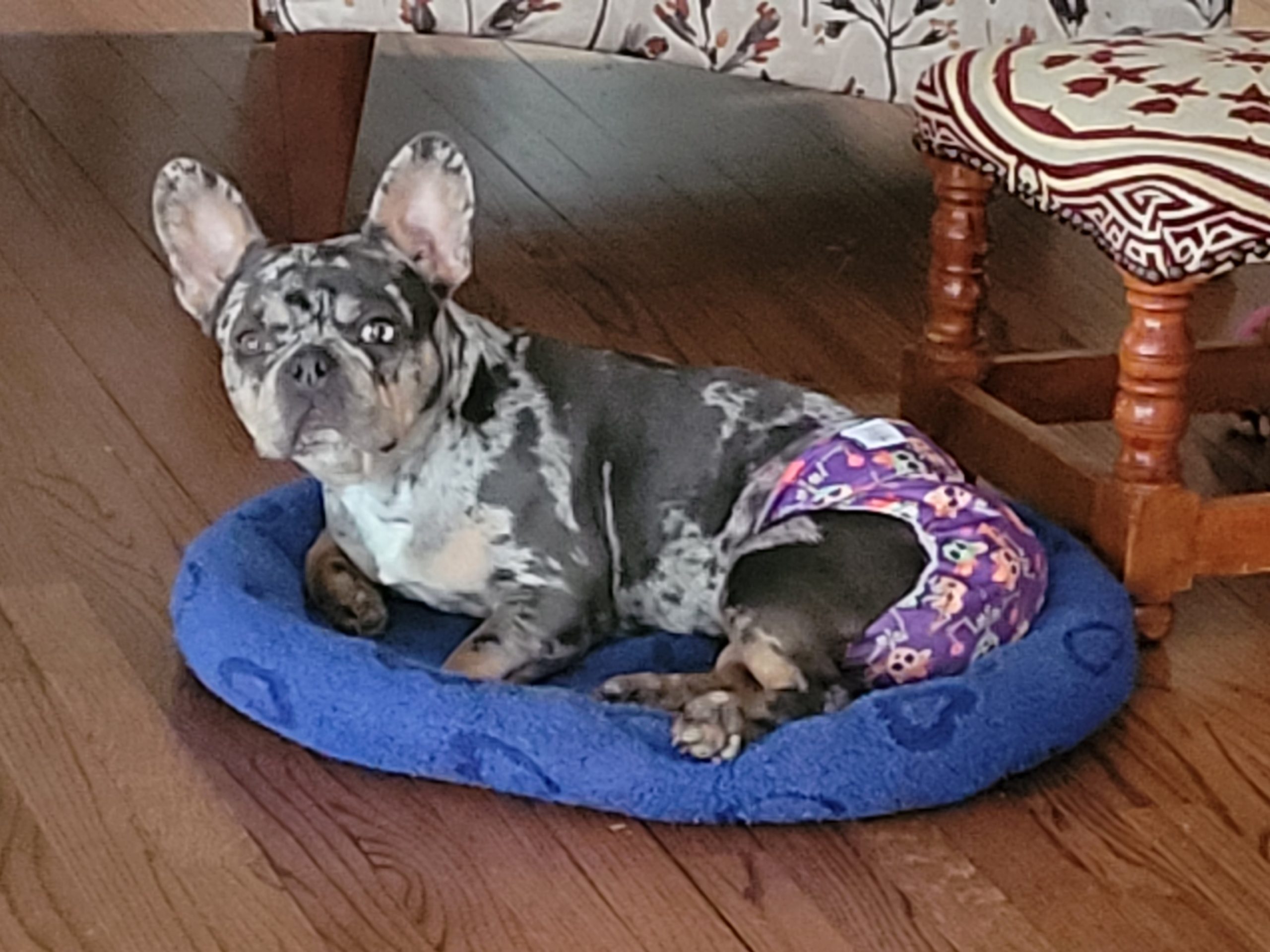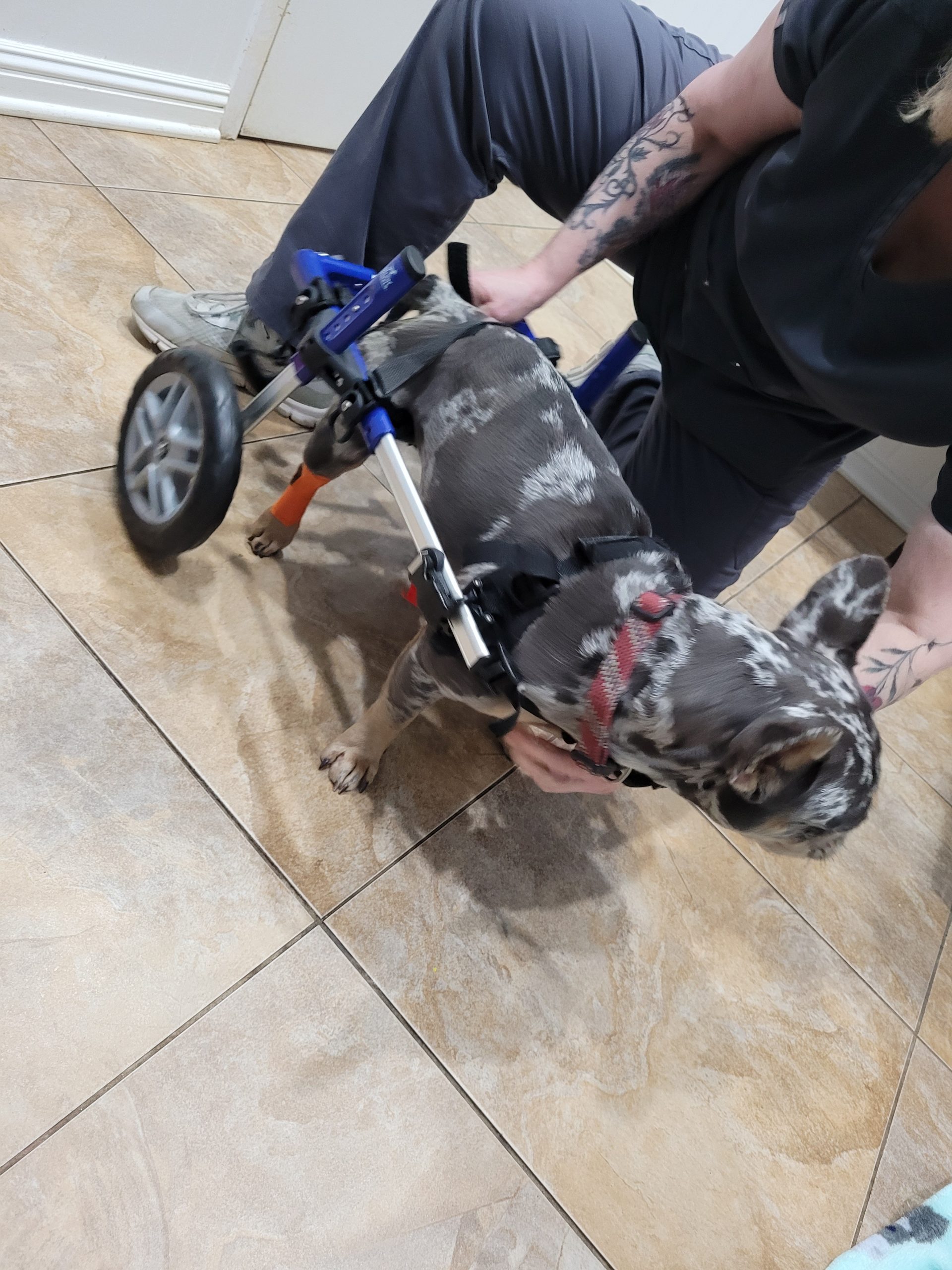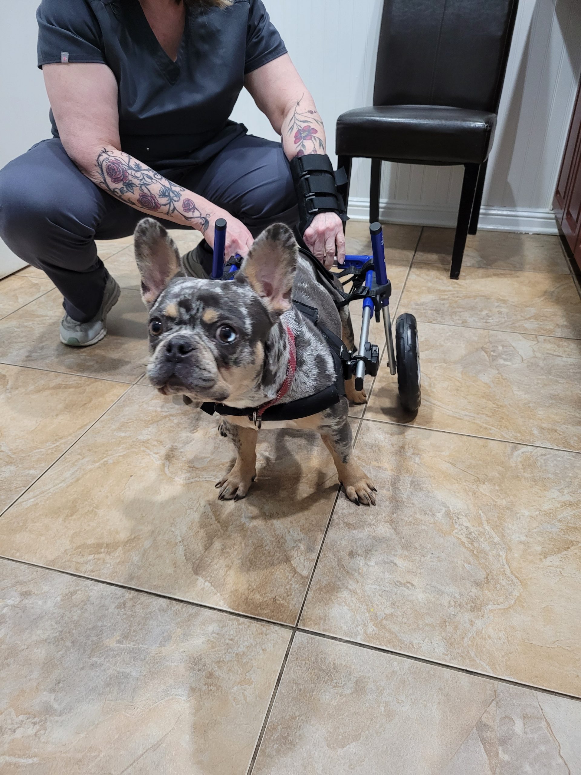 Renni is a super sweet, beautiful blue merle Frenchie who loves people. Renni had some kind of spinal injury that has left her back legs paralyzed and incontinent, but she's not letting that slow her down! She scoots around like a champ and is even faster in her wheels. She wants to be with her person 24/7, so would love to be in a retired or work-from-home family who can keep her clean and dry and give lots of attention.