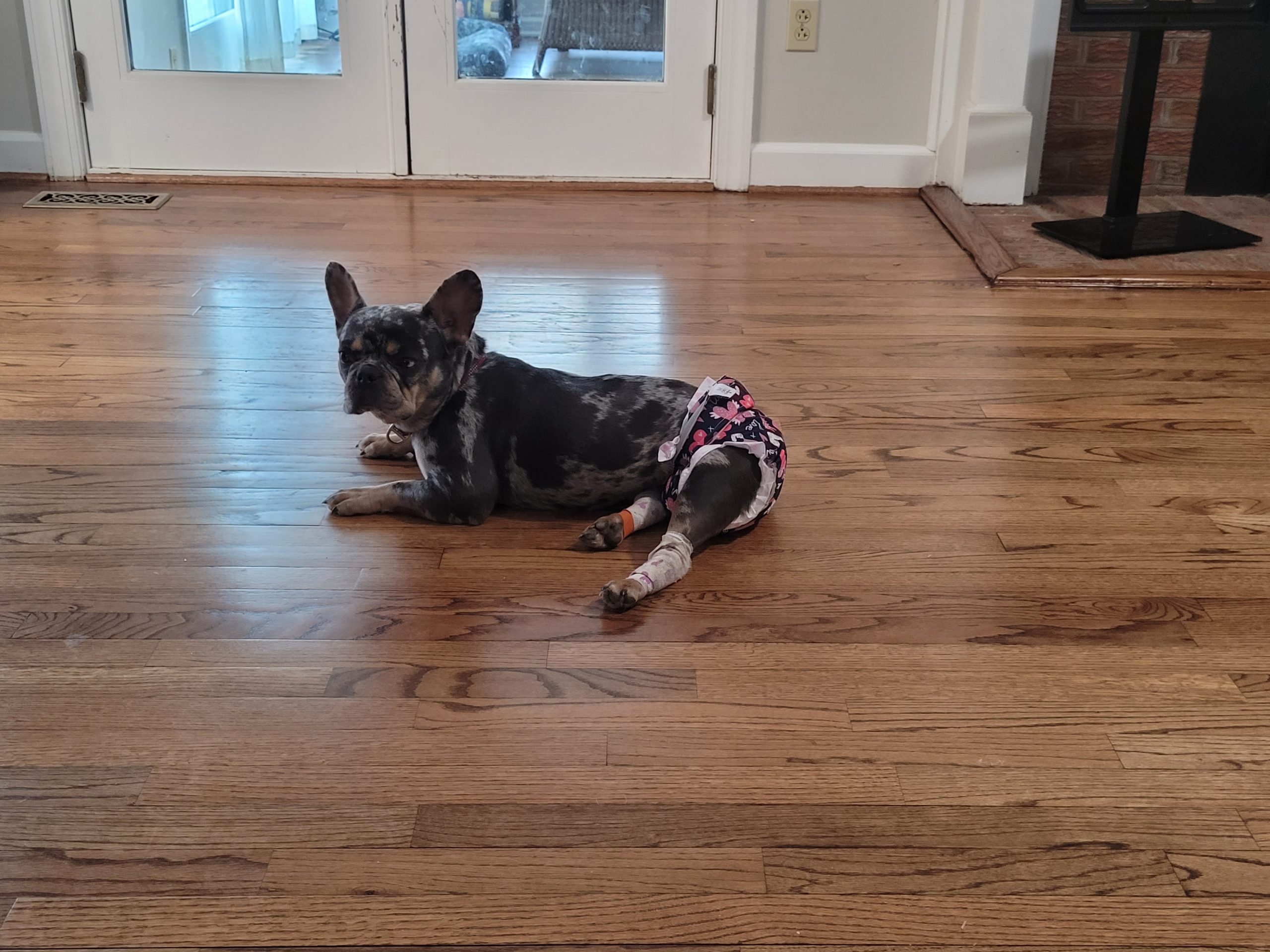 Life is easiest without stairs: she glides around like an ice dancer on the hardwood floors in her foster home. She's usually cooperative for the diaper changes and she has just enough of a tail nub that they really stay on! We've had great sucess with the CuteBone cloth diapers with no tail hole (no leaks)!